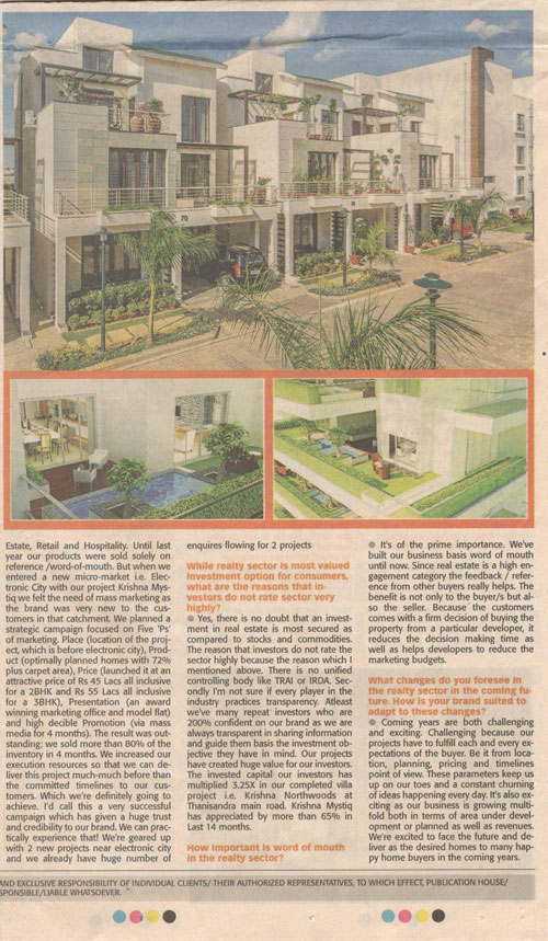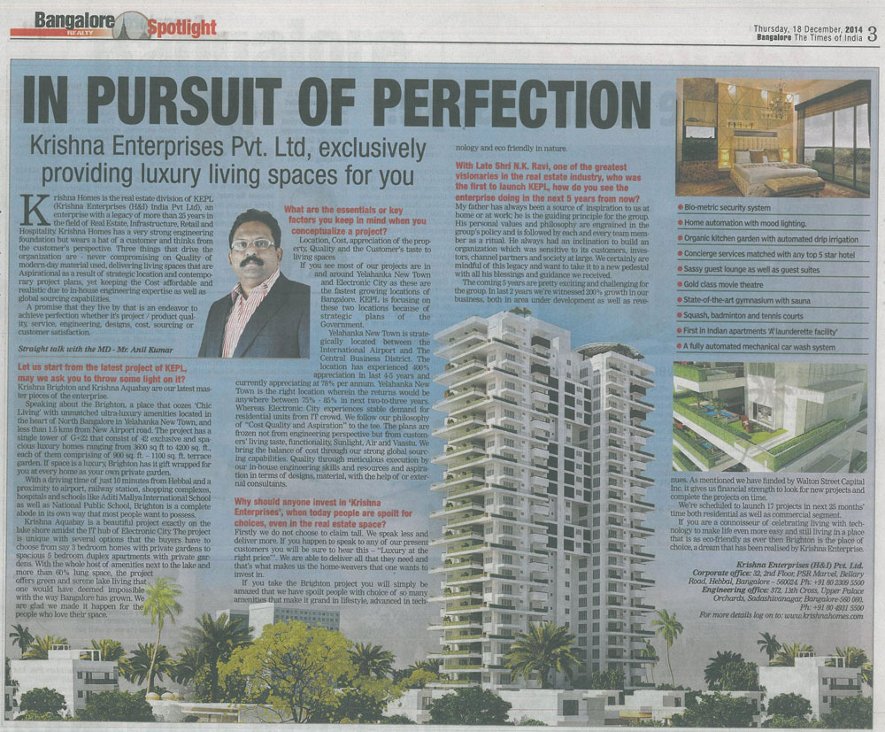 Krishna Homes, real estate business of KEPL Corporation is geared up to welcome new year with three super luxury, niche projects in North Bangalore in the first quarter of 2014 signalling the aggressive growth plans of Real Estate sector in the upcoming year