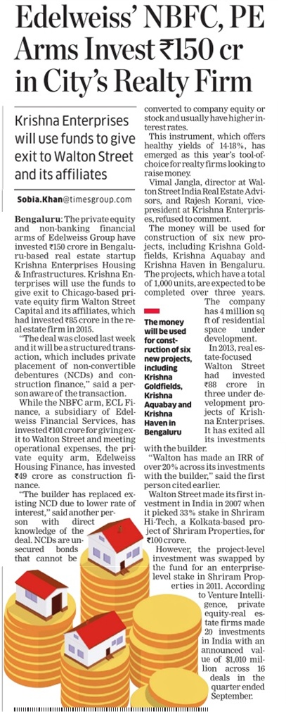 When contacted by VCCircle, Anil Kumar, managing director, Krishna Enterprises, confirmed the development and said, “Investors including an affiliate of Walton Street Capital participated in the successful non-convertible debenture (NCD) issue for projects of Krishna Enterprises.”